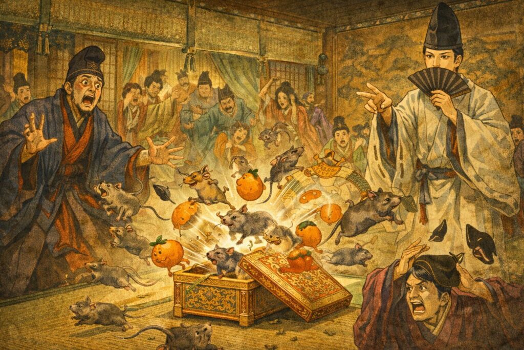 しかし次の瞬間、ミカンは晴明の術によってネズミに姿を変え、四方八方へ逃げ出したのです。