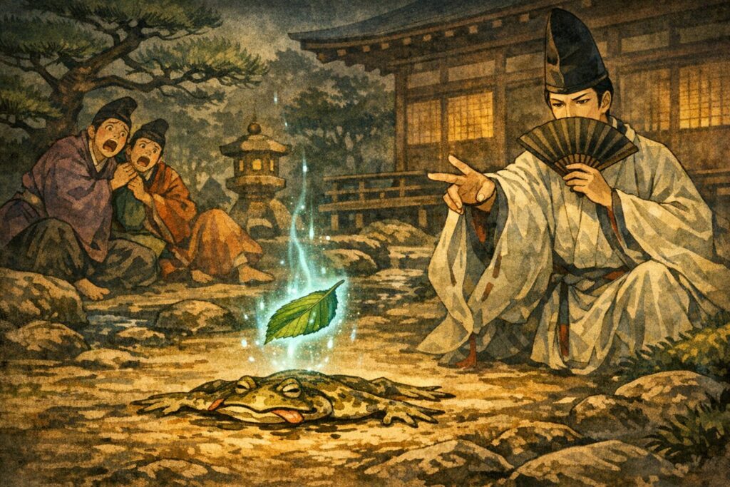 しかし無理に実演を迫られ、庭にいた蛙に草の葉を投じます。