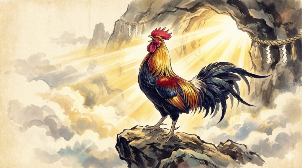 この功績により、鶏は神域を守り、光を呼び込む特別な存在となりました。