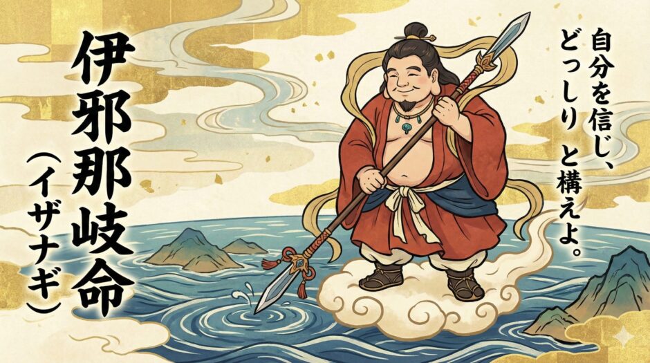 国生みの際に用いた「天沼矛(あめのぬほこ)」を持った姿で描かれることが多く、創造と武勇、そして威厳を象徴しています。