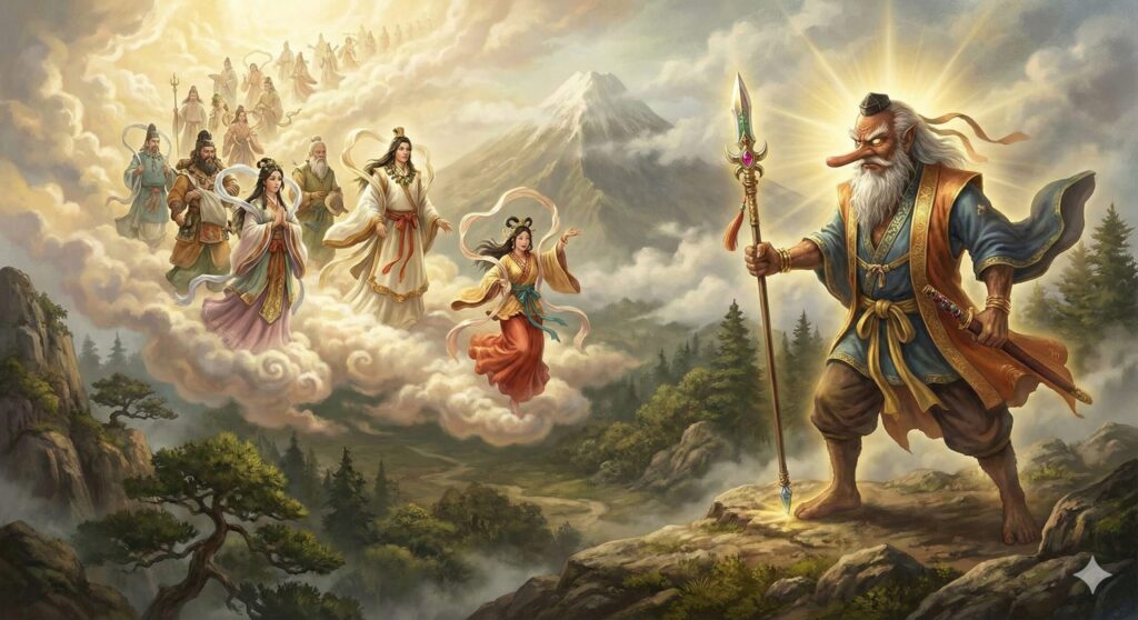 多くの神々がその威圧感に恐れをなす中、芸能の女神であり、大胆不敵なアメノウズメだけが彼に近づき、「あなたは誰ですか!」と問いかけました。