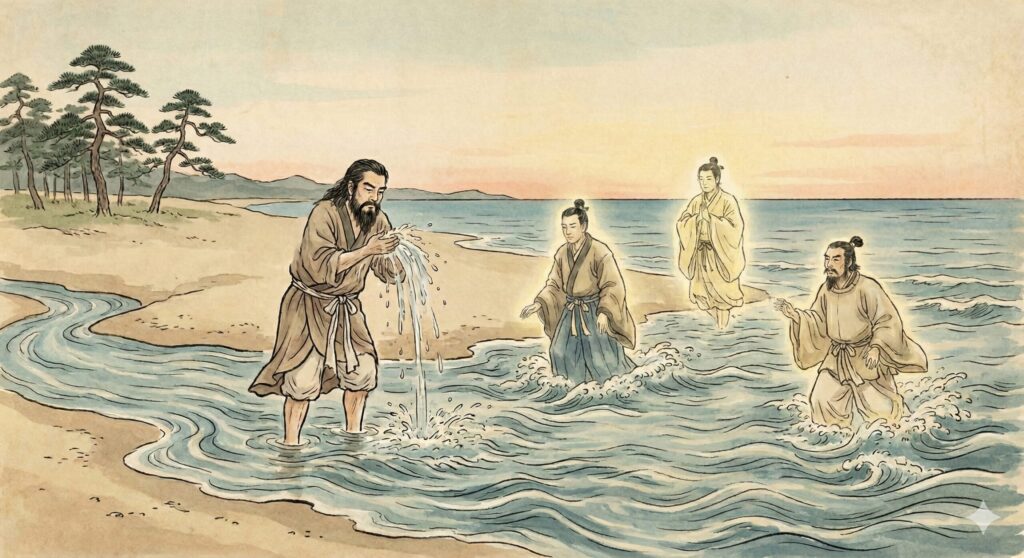 住吉三神(すみよしさんじん)は、伊弉諾尊(いざなぎのみこと)が亡き妻を追って訪れた黄泉の国から帰り、その穢れを洗い流す「禊(みそぎ)」を行った際に誕生しました。
